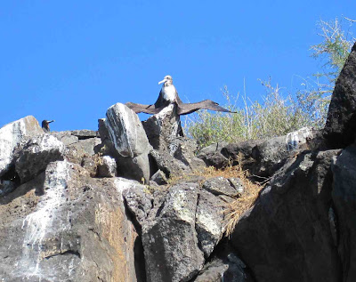 Above is a frigate bird, male, in breeding costume which means he inflates his amazing pouch.Yesterday as well as the breeding frigate birds, we saw a male blue-footed booby doing a dance to attract the lady blue-footed booby. The lady was just sort of sitting nearby. The boobies also lift their beaks up towards the sky, and they whistle. They sound like a person who can’t whistle very well. Finally the lady decides which one she likes best and they bump beaks for a while. They REALLY look like silly boobies. And they are all over the place.